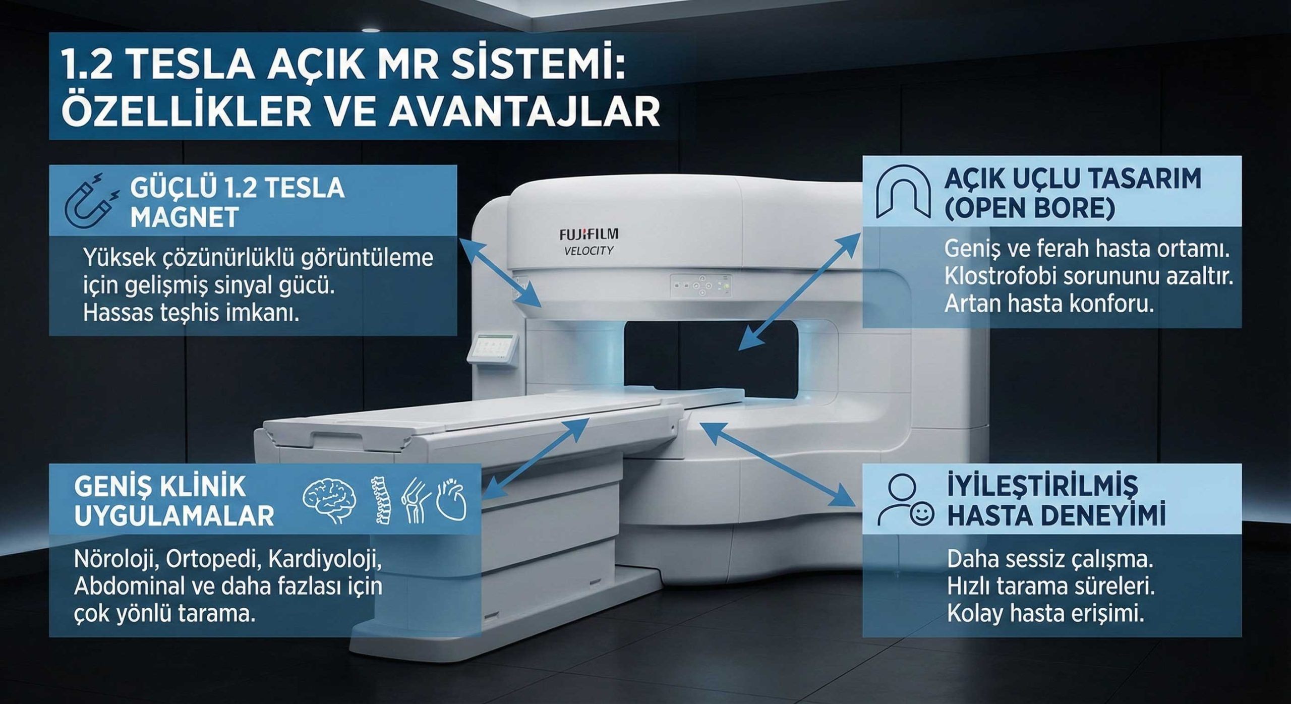 Yeni nesil 1.2 Tesla Açık MR sistemimiz sayesinde birçok incelemede yüksek çözünürlüklü görüntüler elde edilmektedir.